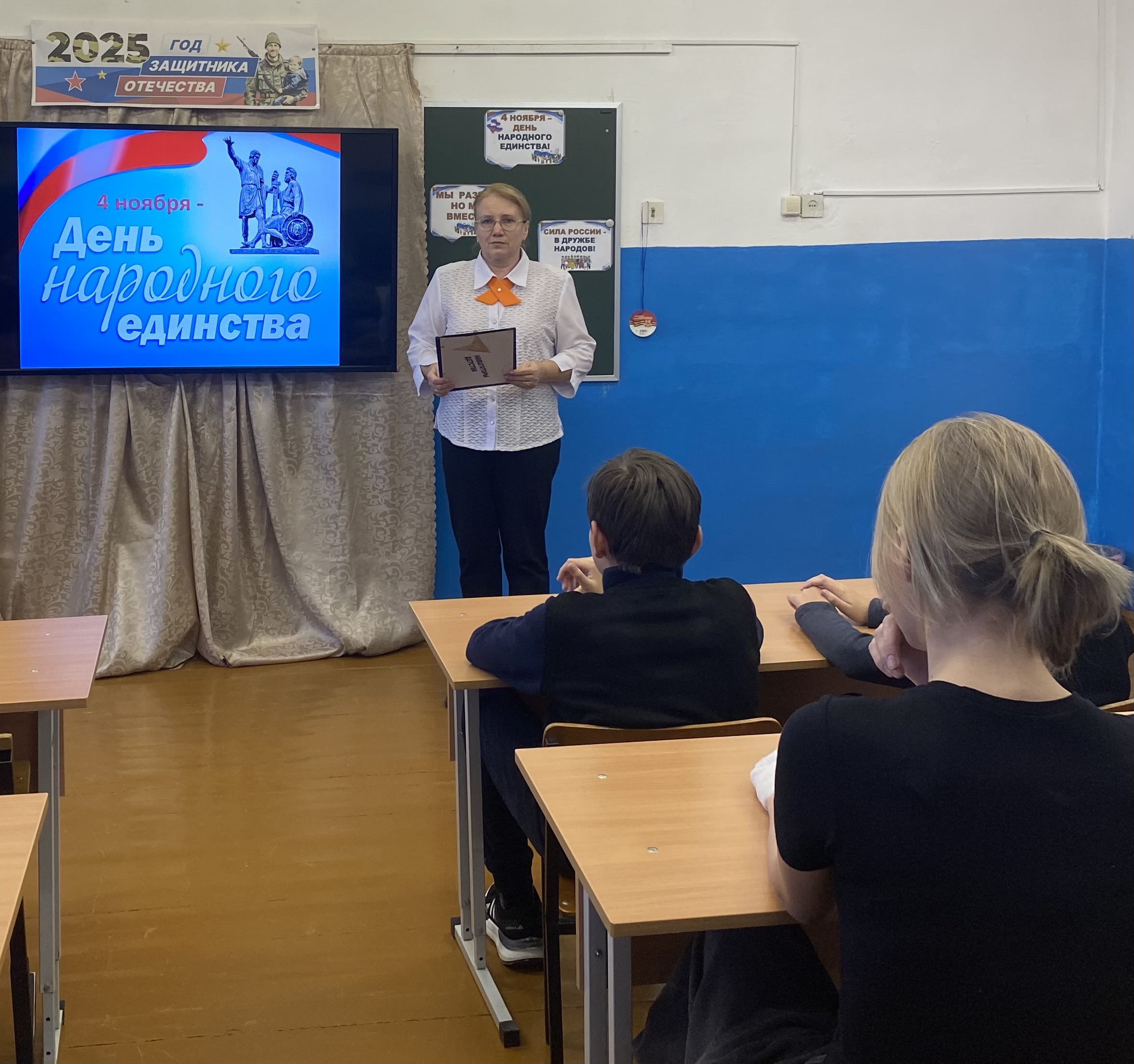 В преддверии Дня народного единства Басавина Наталья Ивановна, советник директора по воспитанию, напомнила ученикам 6-9 классов об истории праздника, организовала просмотр видеоролика: «ДНК России. Мы – многонациональный народ» с последующим обсуждением в формате открытого микрофона. Из фильма ученики узнали много исторических фактов из жизни разных народов, раскрыли секреты древних племён юкагиров, а также услышали ответы на вопросы: Сколько народов живёт в нашей стране? Какой из них самый малочисленный? В чём заключается ключевое отличие России от других многонациональных держав? Кого солдаты Наполеона прозвали «северными амурами"?